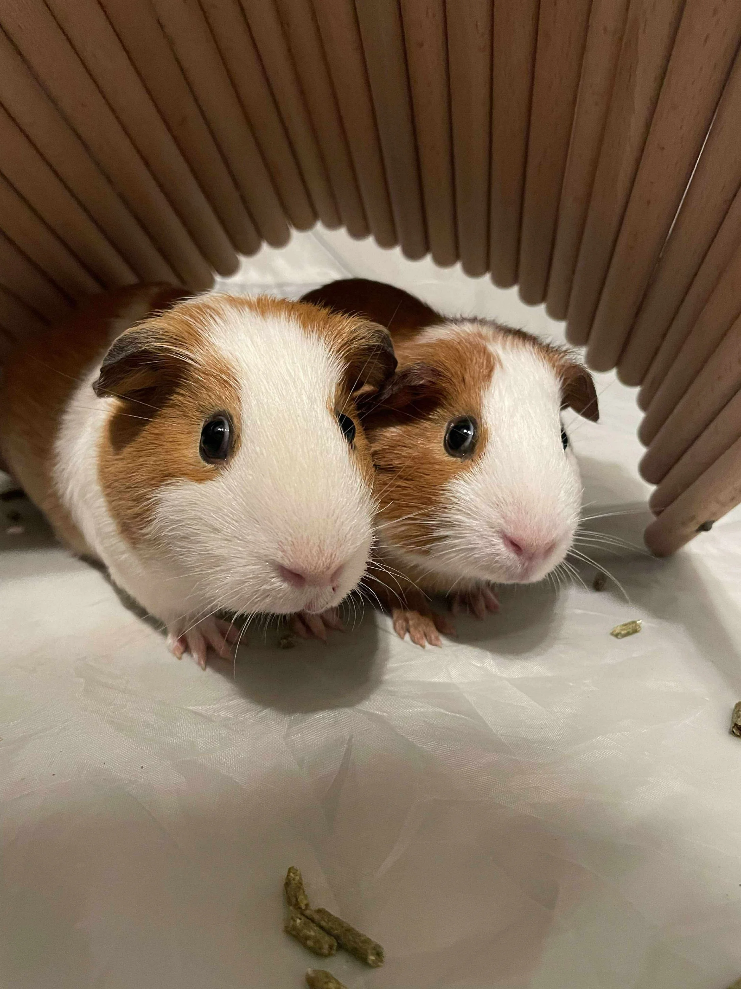 Snickers and Twix are young male guinea pigs rescued from a bad situation. They are both curious and vocal and working on their socialization.