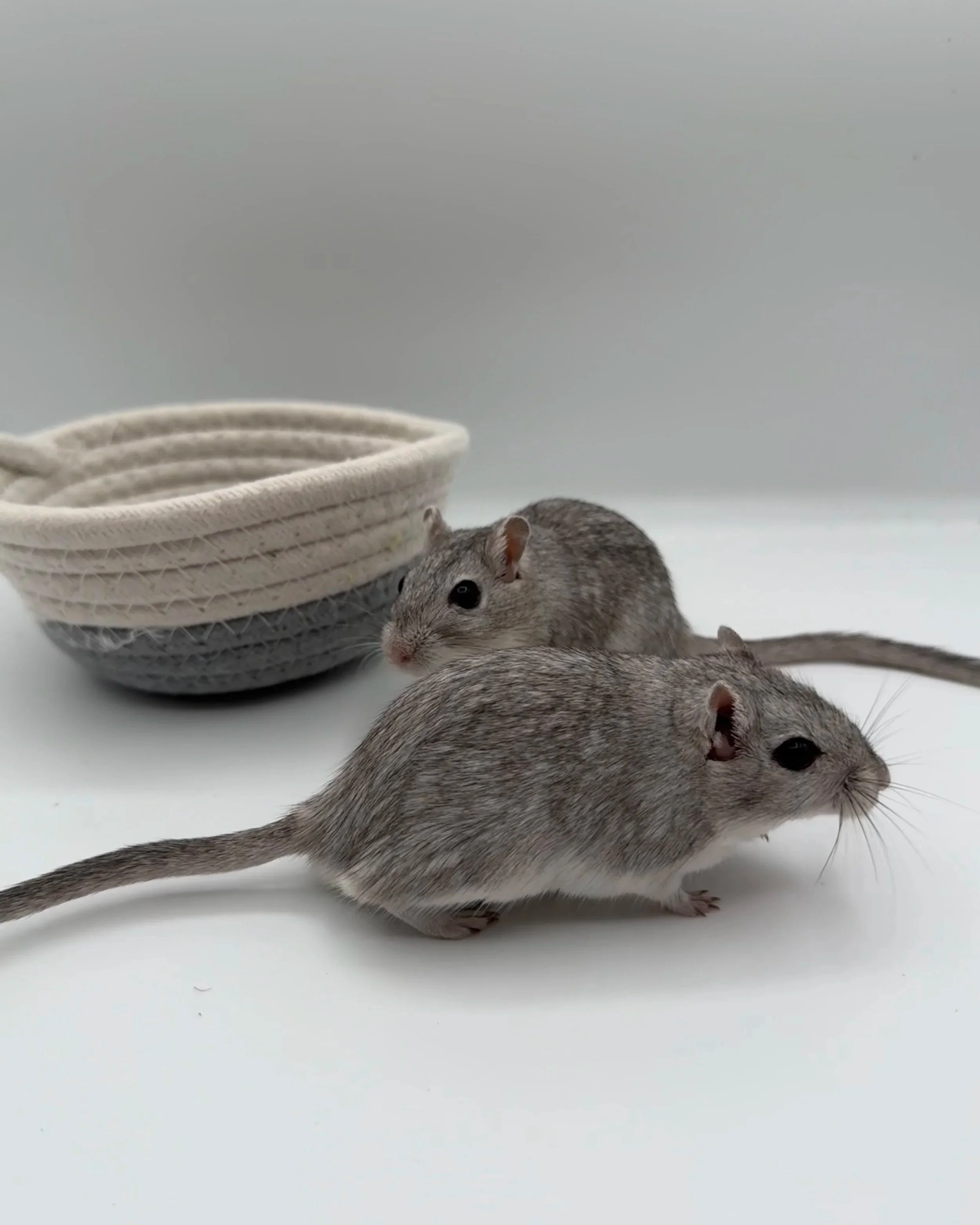 Jiro and Sho are two friendly adult male gerbils. Jiro loves to come out to see what’s happening while Sho is a master tunnel creator. Both will crawl on hands and don’t mind being held although they are both prefer to be redesigning their enclosure.