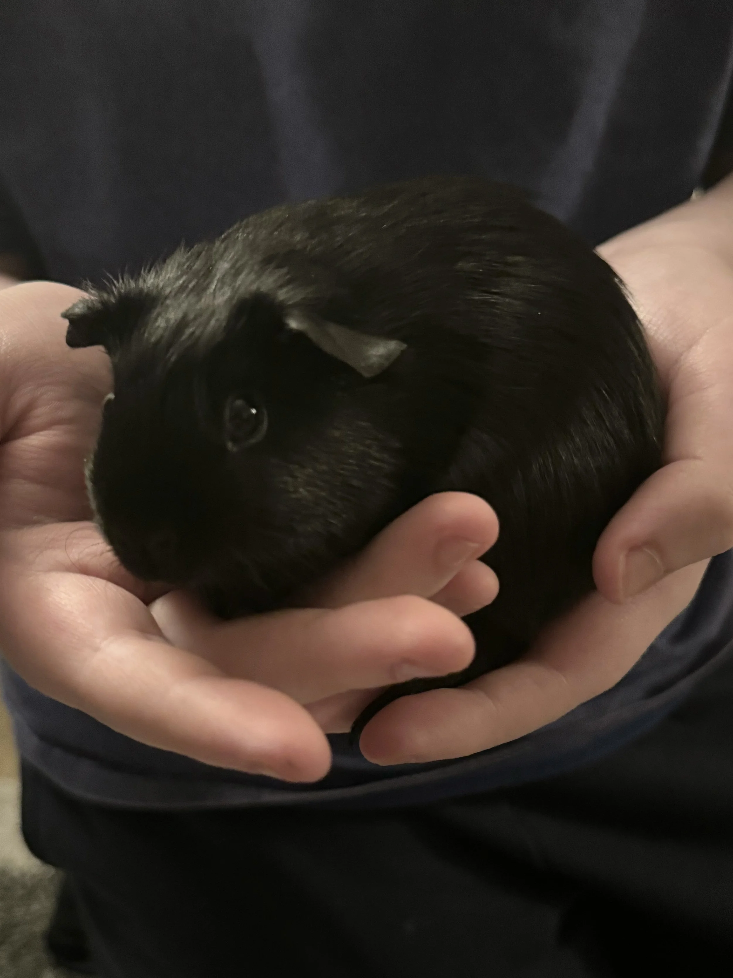 Rumi is a very young female guinea pig that was found in the parking lot after a reptile expo covered in fleas. She is all black and very sweet. She loves to crawl into your hair or under beards. We estimate she is about 2-3 months old. She will be available to a home with another female (or neutered male) Guinea pig once her evaluation is over.